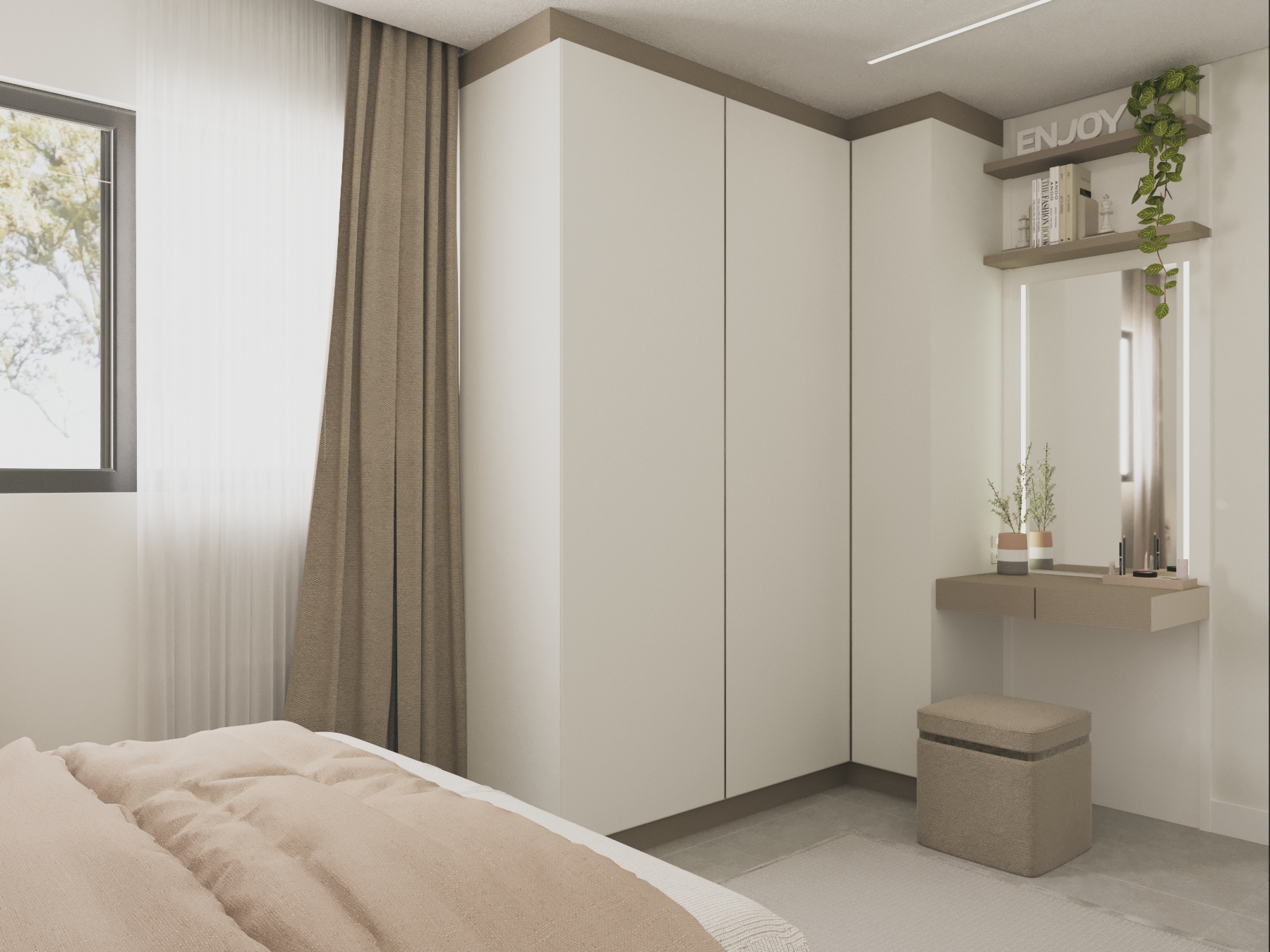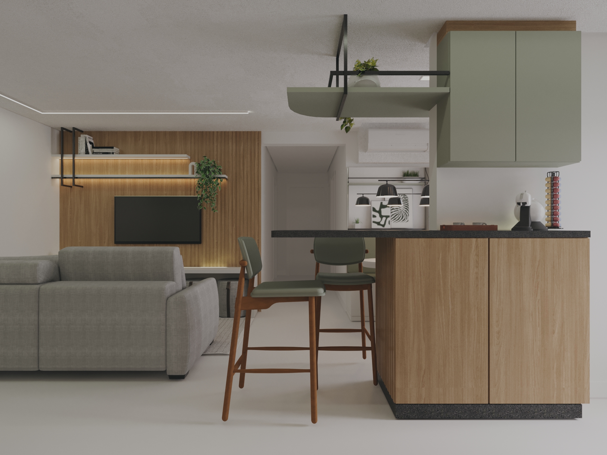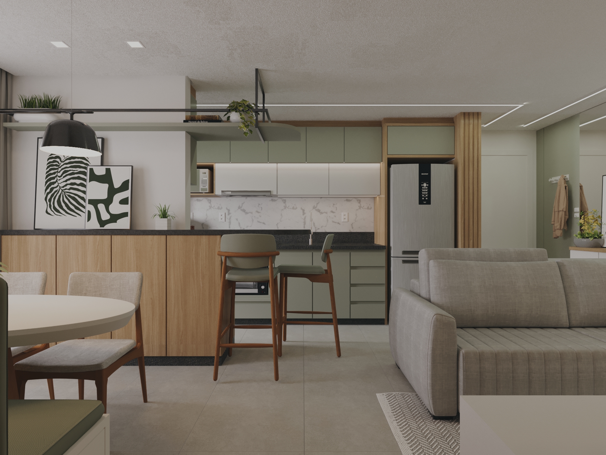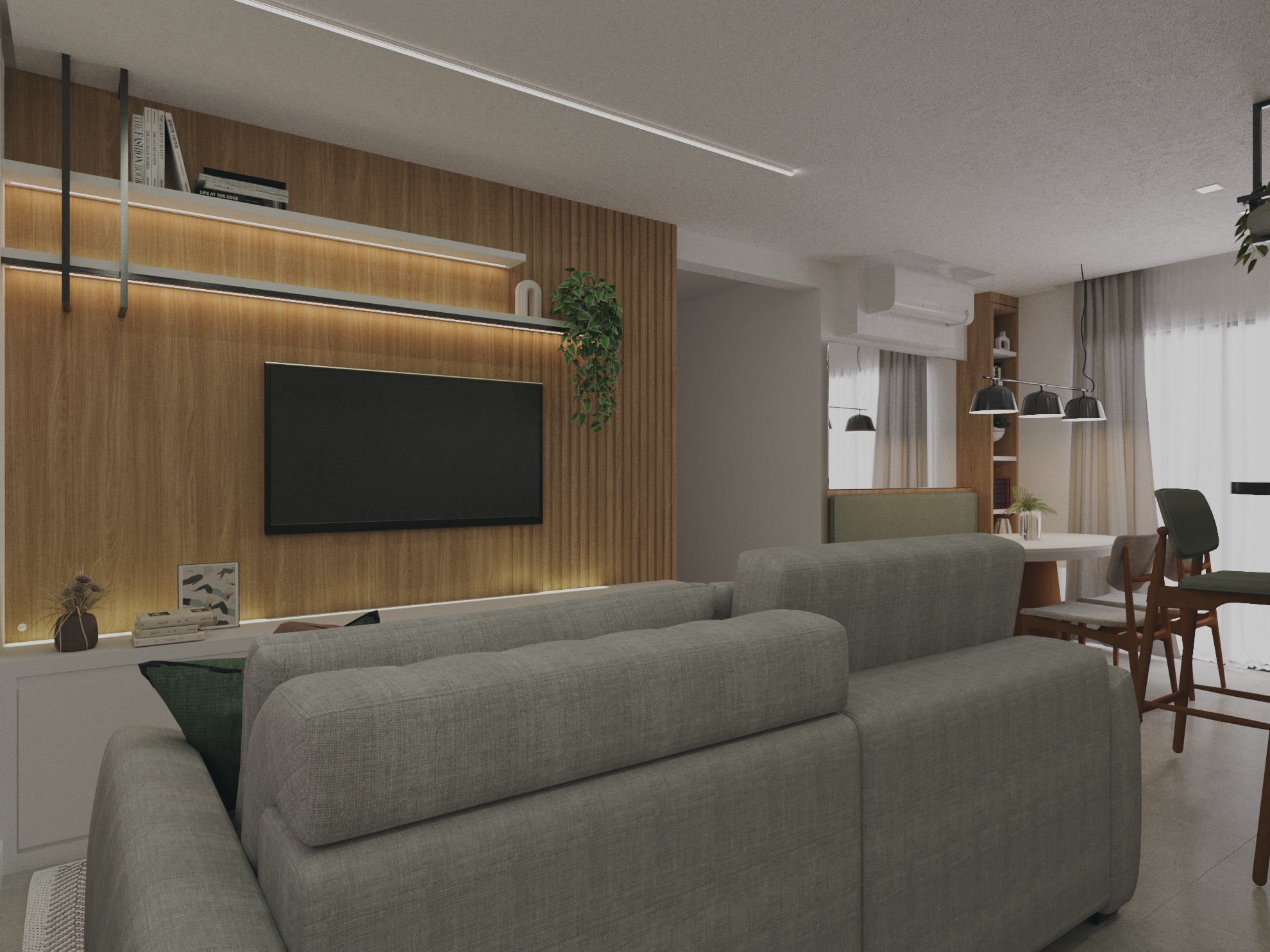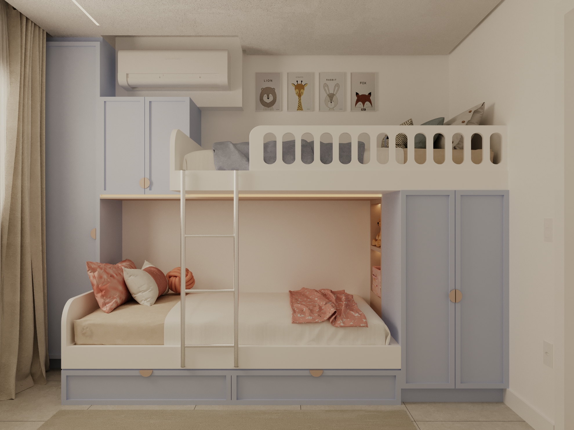 O apartamento na praia reflete a personalidade de cada morador, com cores e detalhes que fazem sentido para quem vive cada espaço. Na área social, MDF Verti, Jequitibá e branco equilibram sofisticação e acolhimento. Cada ambiente ganhou sua identidade: os banheiros em diferentes tons de verde, os quartos adaptados ao gosto de quem os usa — do neutro ao vibrante quarto das meninas, em rosa sal, azul sereno e branco. O resultado é um lar único, colorido e cheio de personalidade, pensado para ser vivido e celebrado por todos.