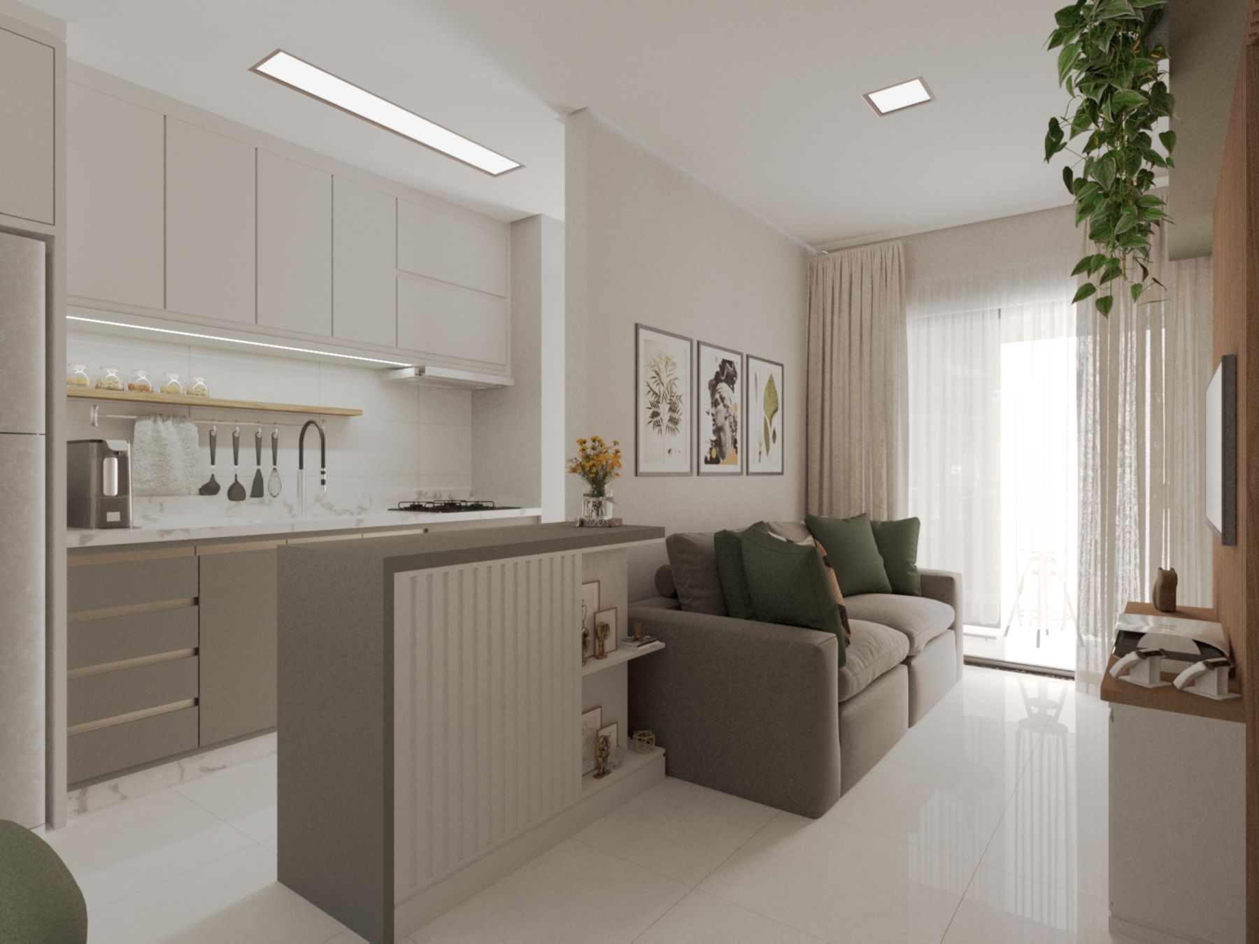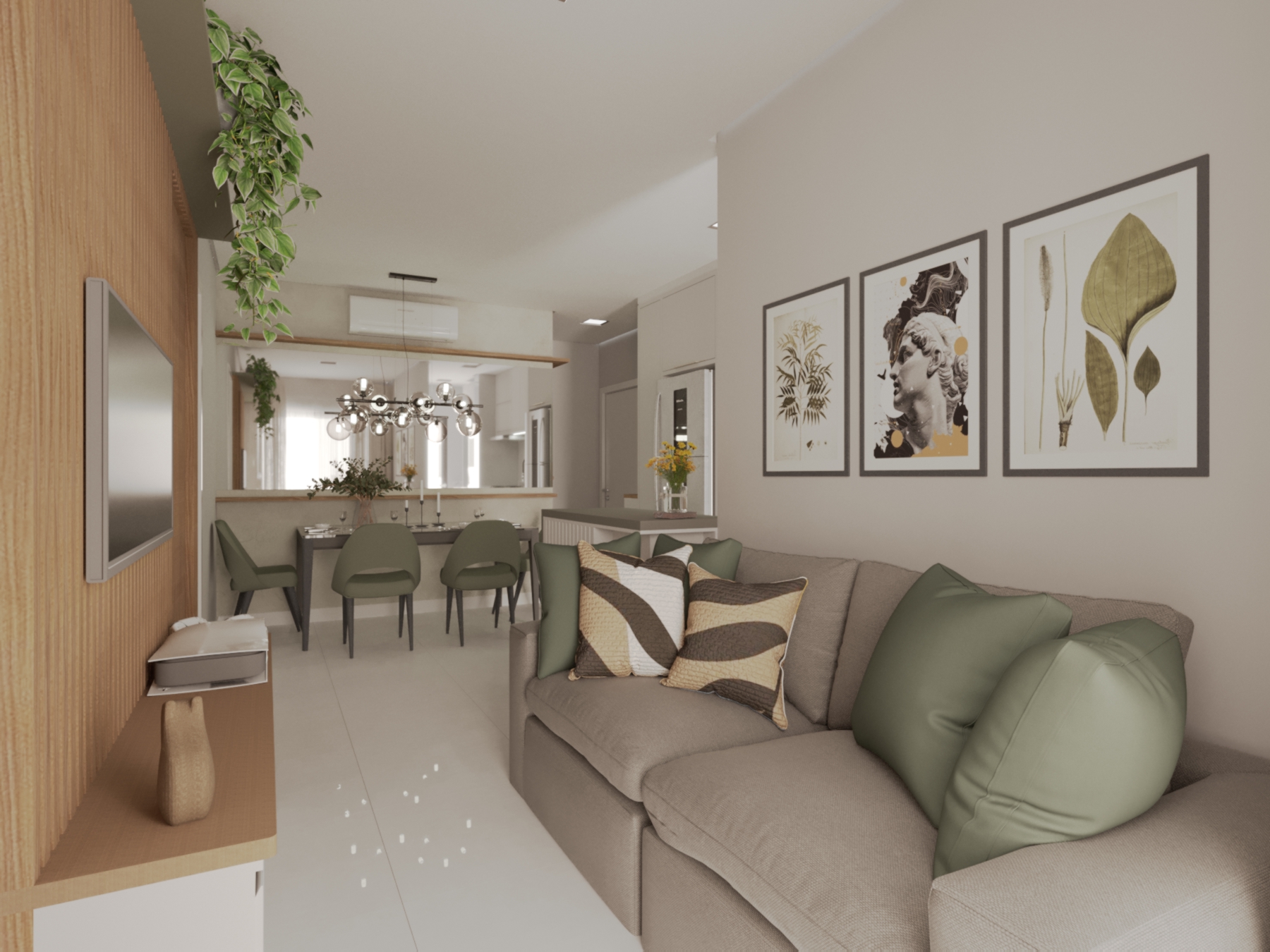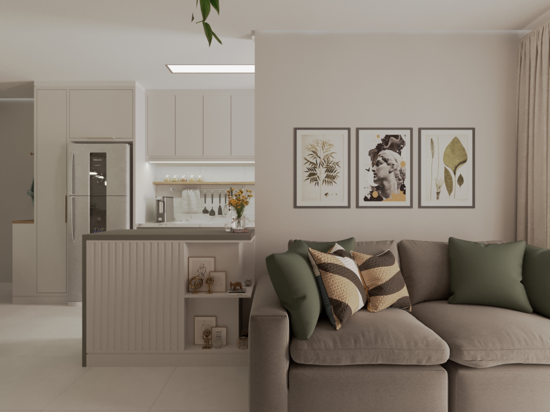 O apartamento do casal foi pensado para refletir sua personalidade e trazer acolhimento, com uma base clean em tons neutros, MDF Verti e madeira, equilibrando sofisticação e calor. Detalhes divertidos, como os dinossauros de madeira no hall, a capivarinha no hack e a placa de The Office no escritório, revelam a identidade dos moradores. Cada ambiente foi planejado de acordo com a rotina e os hábitos do casal, unindo praticidade e estilo de forma natural.